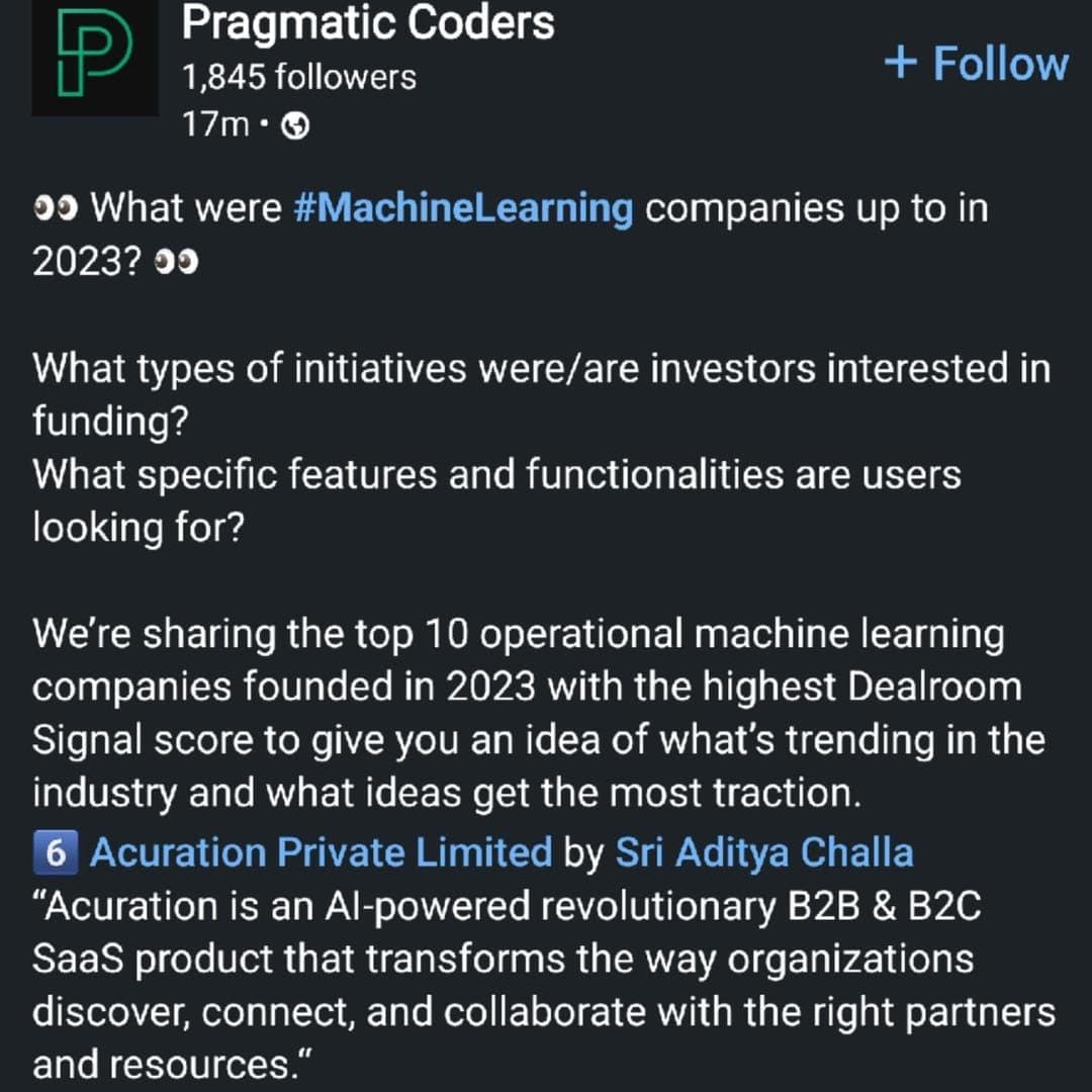 Pragmatic Coders, based in Kraków, Małopolskie, Poland, has identified Acuration Private Limited as one of the top 10 operational Machine Learning companies founded in 2023 in their research report. This recognition motivates us to continue innovating and advancing our mission.